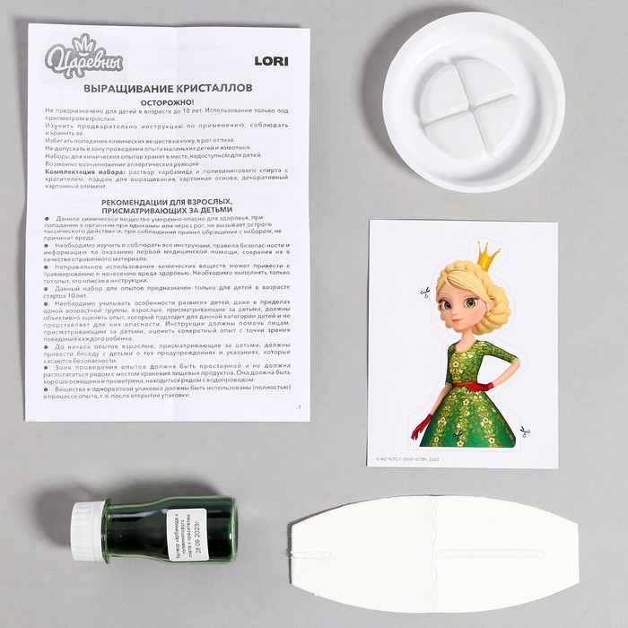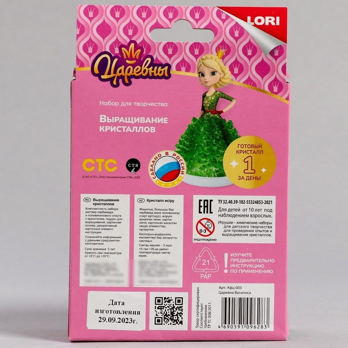 Выращивание кристаллов «Царевна Василиса» — вырасти яркий и необычный кристалл с любимыми героинями мультфильма «Царевны». Опыт провести очень просто, а результат появится в этот же день. Благодаря набору малыш сможет получить знания о том, как протекает кристаллизации веществ.