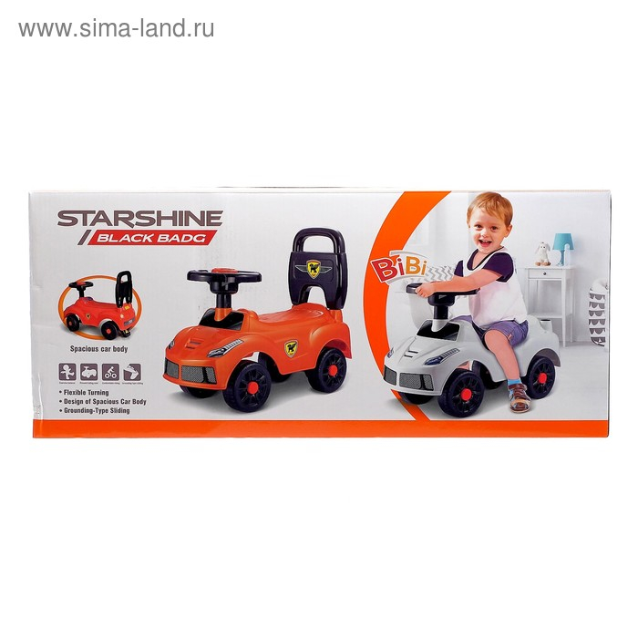- Лёгкий и компактный, его легко переносить и хранить. Он имеет удобное сиденье и руль, который поворачивается на 90 градусов. В руле встроена кнопка-гудок, которая срабатывает при нажатии.