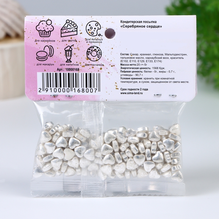 Кондитерская посыпка "Серебряное сердце" - это незаменимое украшение для Вашего праздничного стола. Даже самый простой в исполнении десерт заиграет яркими красками благодаря нашей кондитерской посыпке.