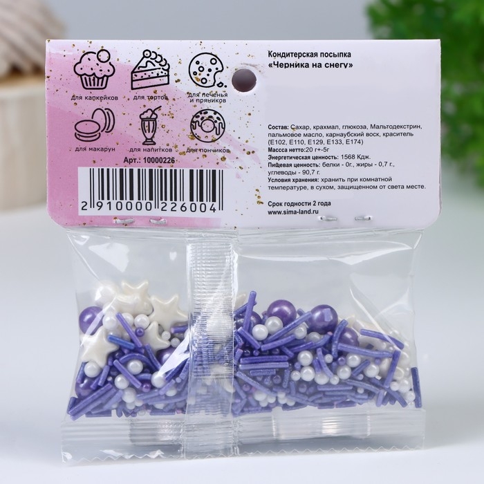 Кондитерская посыпка "Черника на снегу" - это незаменимое украшение для Вашего праздничного стола. Даже самый простой в исполнении десерт заиграет яркими красками благодаря нашей кондитерской посыпке.