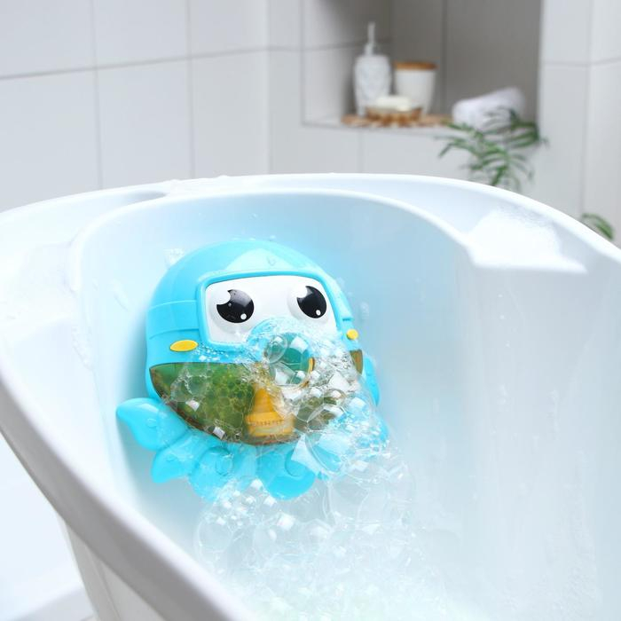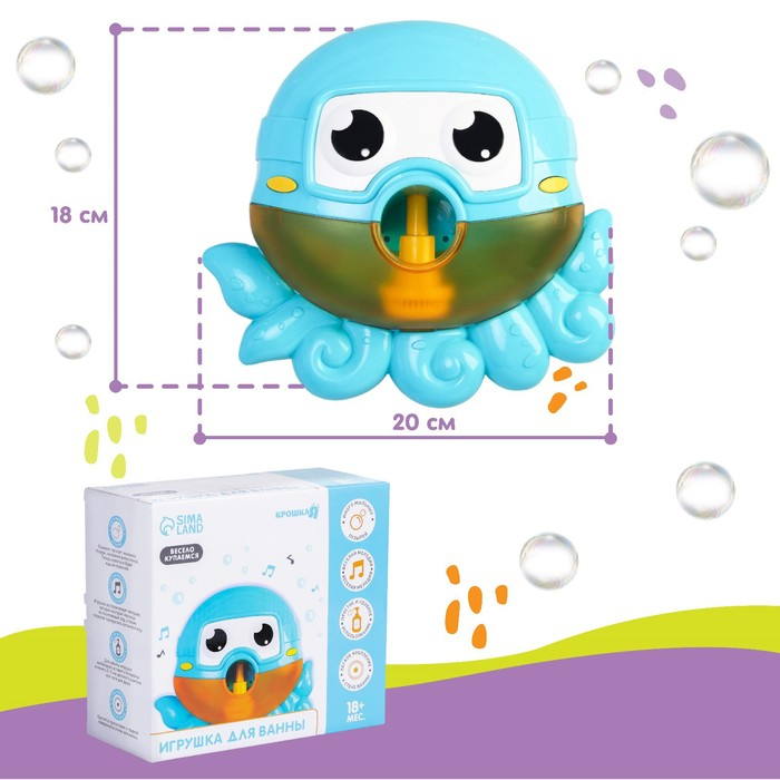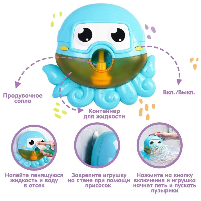 С музыкальным веселым осьминогом купаться одно удовольствие! При наполнении игрушки ароматным шампунем или пеной для ванны, под мелодии она начнет генерировать мыльные пузыри. Игрушка помогает вашему малышу развивать воображение, а также визуальное и слуховое восприятие. Контрастные цвета привлекают внимание и благоприятно влияют на способность фокусировать зрение.