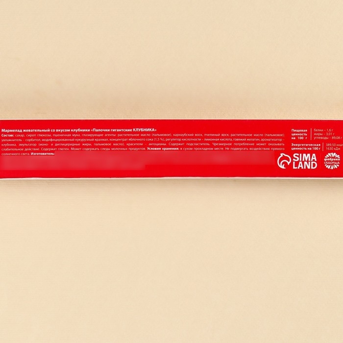 Состав: сахар, сироп глюкозы, пшеничная мука, глазирующие агенты: растительное масло (пальмовое), карнаубский воск, пчелиный воск; растительное масло (пальмовое); увлажнитель – сорбитол, модифицированный кукурузный крахмал, концентрат яблочного сока 1,5 %, регулятор кислотности – лимонная кислота, говяжий желатин, ароматизатор – клубника, эмульгатор (моно- и диглицеридные жиры, пальмовое масло), красители – антоцианы.
