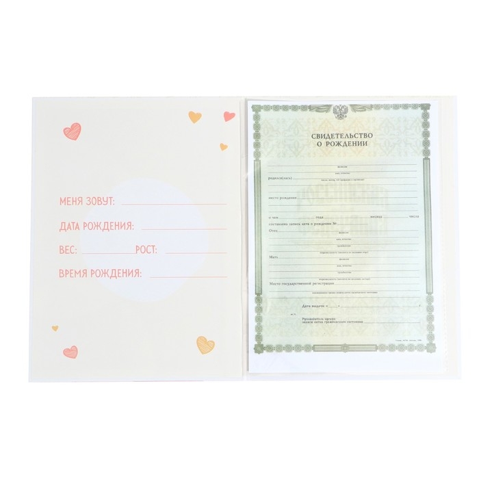 Папка под свидетельство о рождении формата А4 имеет удобный файл внутри, который защитит первый в жизни документ малыша от повреждений.