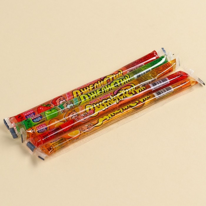 Состав: очищенная вода, регуляторы кислотности (лимонная кислота, яблочная кислота, цитрат натрия), загуститель (каррагинан), подсластители (аспартам, сукралоза), консервант (сорбат калия), ароматизаторы (клубника, яблоко, апельсин, виноград), красители Е102, Е110, Е129, Е133, Е171.
