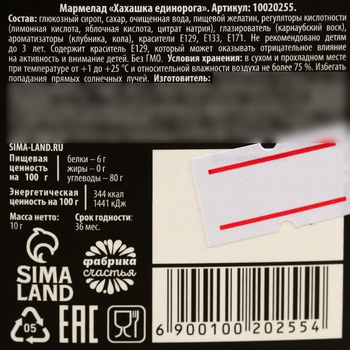 Состав: глюкозный сироп, сахар, очищенная вода, пищевой желатин, регуляторы кислотности (лимонная кислота, яблочная кислота, цитрат натрия), глазирователь (карнаубский воск), ароматизаторы (клубника, кола), красители Е129, Е133, Е171.