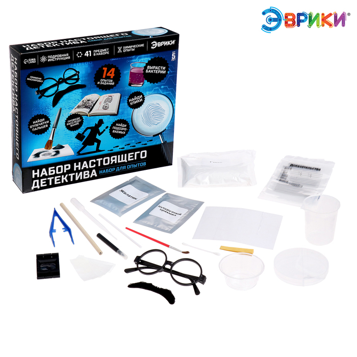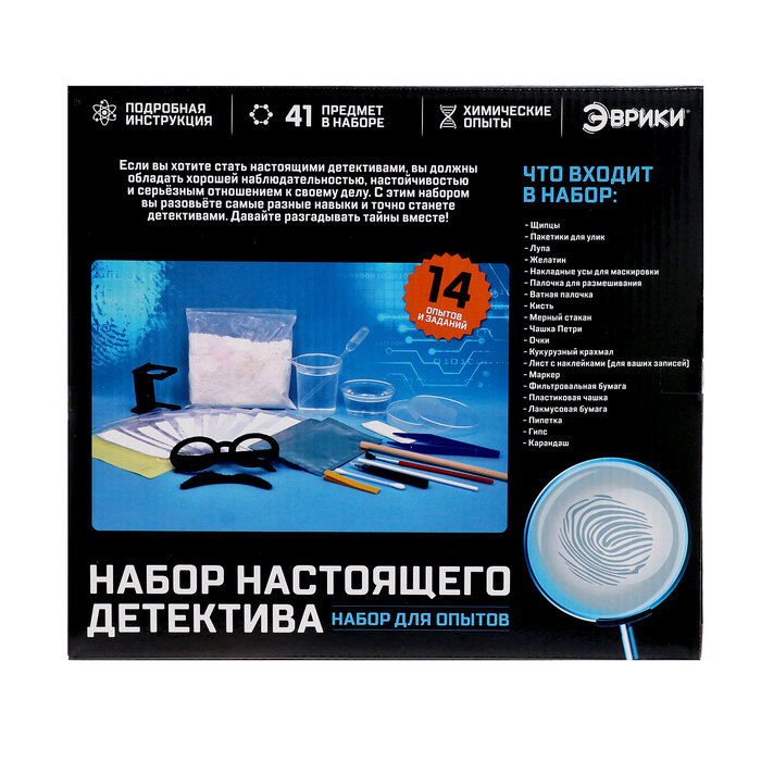 С увлекательным набором для опытов ребёнок почувствует себя настоящим детективом, научится быть более внимательным и сможет сам попробовать раскрыть преступление.
