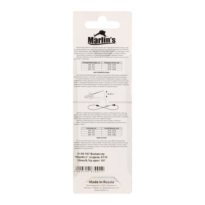 Балансиры «Marlin’s» - превосходно подходят для ловли любого речного хищника. Они обладают виртуозной игрой и идеальной сбалансированностью. Оптимальный ассортимент форм и широкая гамма расцветок позволит удовлетворить любые потребности рыболовов.
