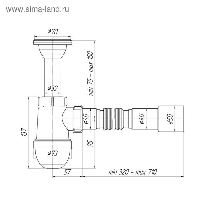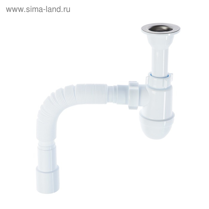 Сифон бутылочного типа предназначен для кухонной мойки с диаметром сливного отверстия 50 мм.