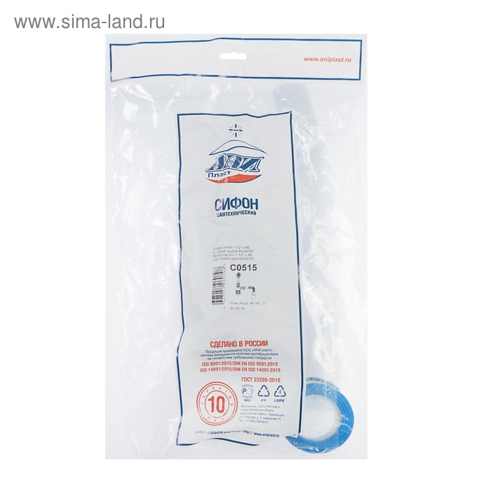 Сифон для мойки "АНИ Пласт" D0110, 1 1/2"х40 мм, прямоточный, с гофрой 40x50 мм