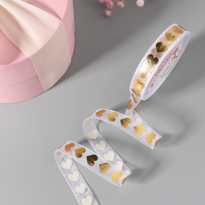 Лента капроновая с тиснением «Сердца», 15 мм, 23 ± 1 м, цвет белый/золотой
