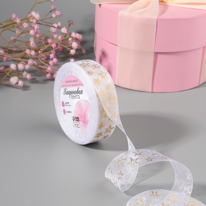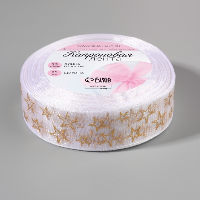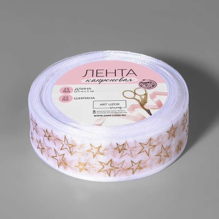 Лента капроновая с тиснением «Звёзды», 25 мм, 23 ± 1 м, цвет белый/золотой