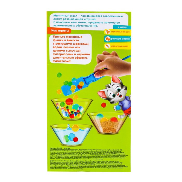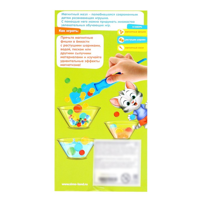 Придумайте множество увлекательных обучающих игр. Например, спрячьте магнитные фишки в ёмкости с растущими шариками, водой, песком или другими сыпучими материалами. Изучайте удивительные эффекты магнетизма с помощью волшебного жезла!