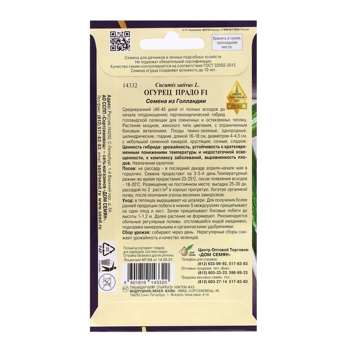 Прадо F1 - ранний партенокарпический гибрид гладкого огурца. Растения сильнорослые, степень ветвления средняя. Листья темно-зеленые, среднего размера, облиственность растения хорошая.Гибрид формирует в каждом узле по 1-2 плода. Плоды однородные, цилиндрической формы, длиной 16-18 см, темно-зеленого цвета, без горечи, с отличными вкусовыми качествами.