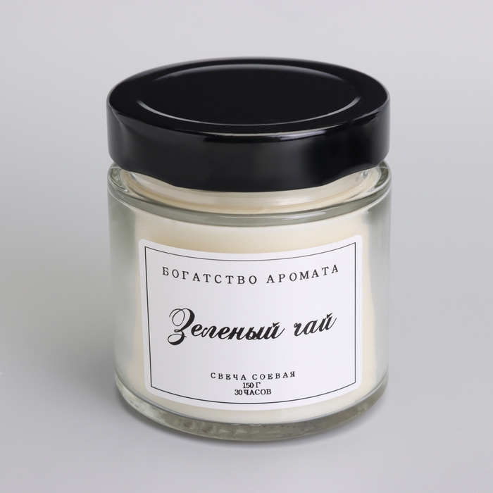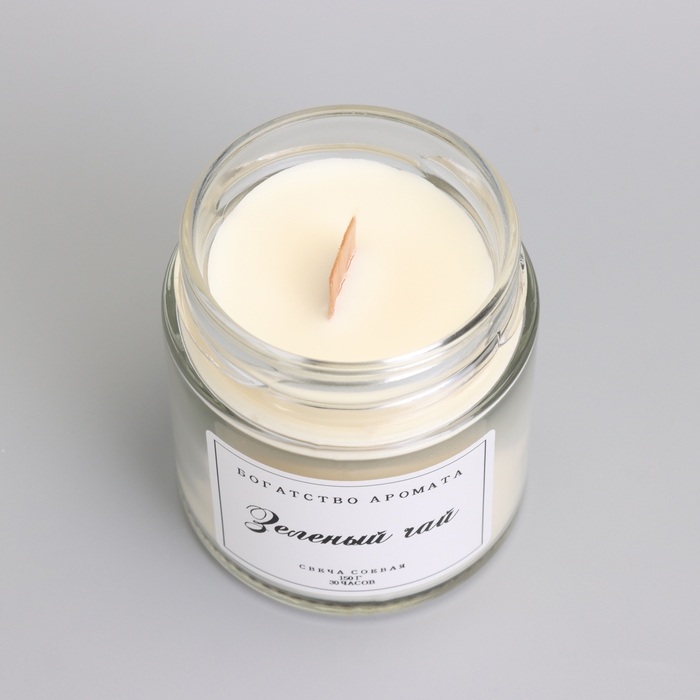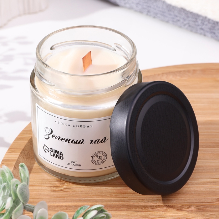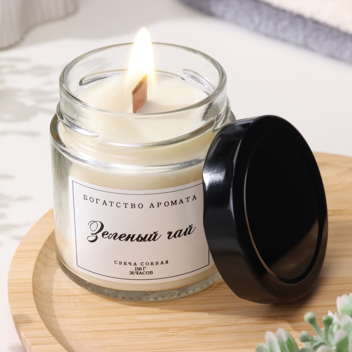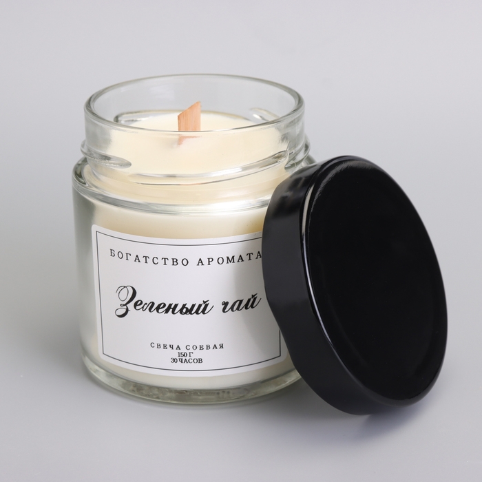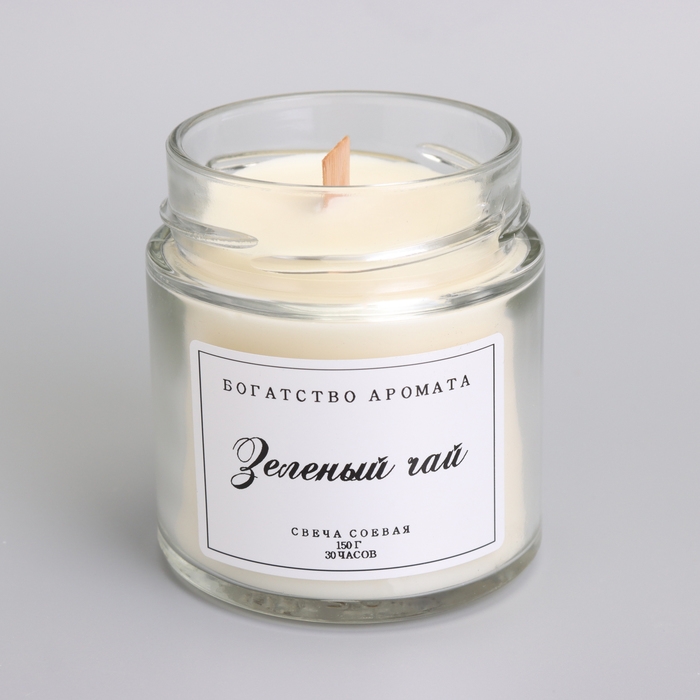 Свеча ароматическая из соевого воска в банке, 150 г, деревянный фитиль, зеленый чай