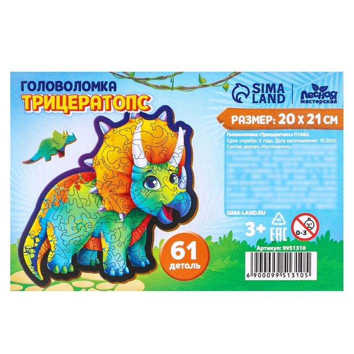 Пазл деревянный фигурный «Трицератопс», 61 элементов