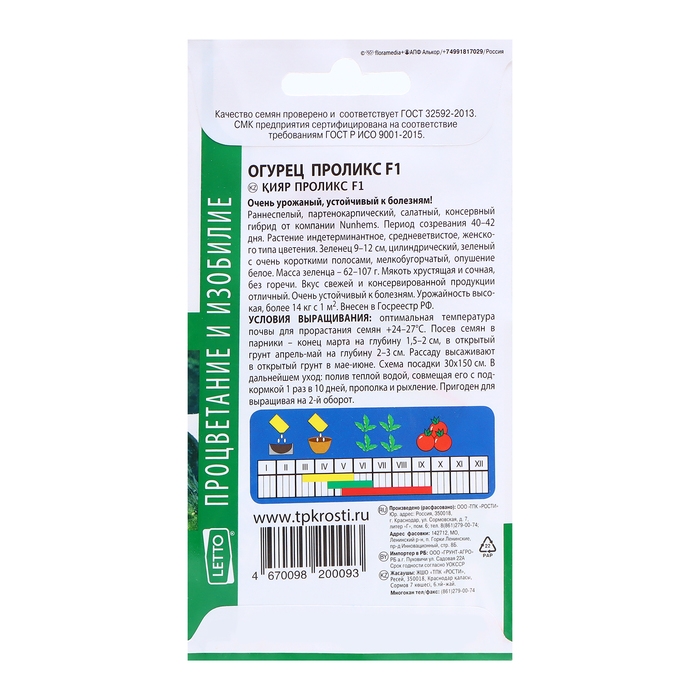 Огурцы Проликс f1 выращиваются, как правило, в открытом грунте. Однако подходят и для выращивания в теплице, либо в парниках. Следует отметить, что сорт не нуждается в опылении насекомыми, то есть он партенокарпический. По сроку созревания огурцы относятся к среднеспелым сортам. Плодоношение начинается через 40-50 дней после появления ростков. - Кустики растения достаточно высокие – достигают 2,5 м; - Боковые стебельки кустов укорочены; - Плодоношение огурцов пучковое; - Плоды растения имеют цилиндрическую форму и достигают размеров до 12 см; - Кожура огурцов глянцевая и имеет ярко-зеленый окрас с бугорками и умеренным опушением; - Мякоть огурцов сочная и хрустящая, не горчит. Сорт Проликс f1 отличается нетребовательностью к уходу, который славится высокой урожайностью и способностью к регенерации.
