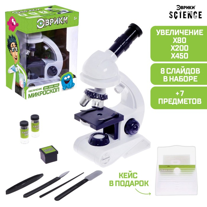 Микроскоп увеличивает изображение в 80‒450 раз. С оптическим инструментом учёба превратится в увлекательный процесс, а все естественные науки перейдут в разряд любимых. Прибор станет хорошим дополнением к школьной литературе.