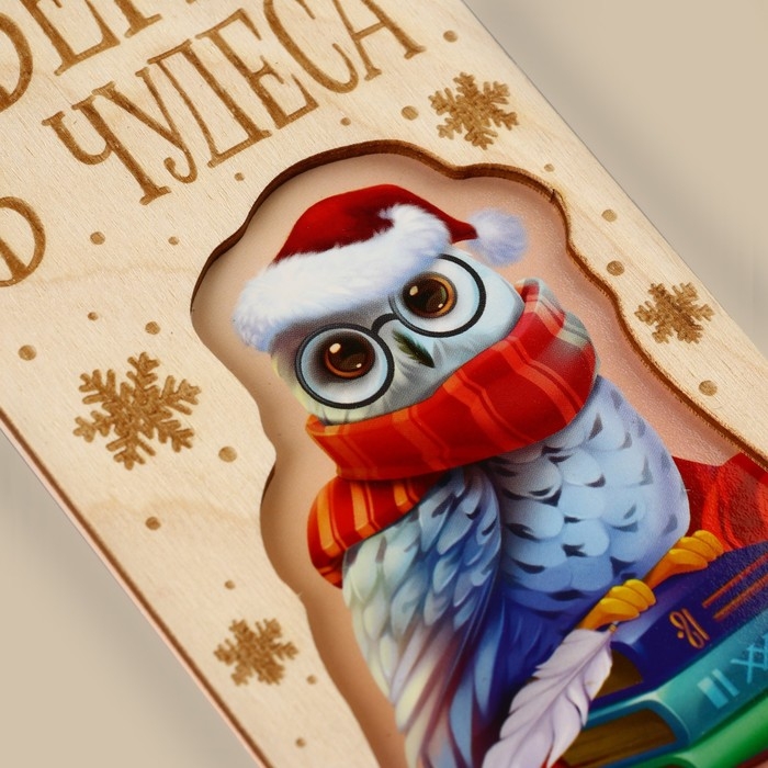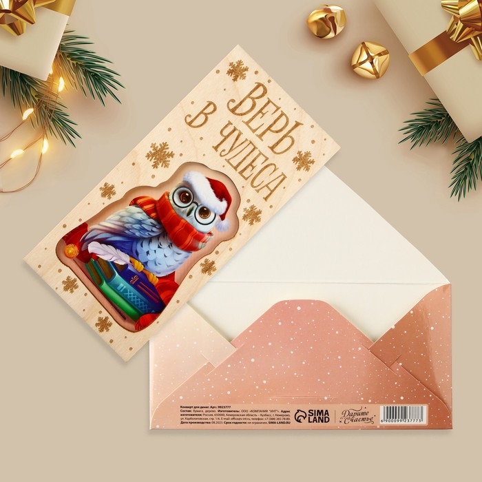 Конверт для денег деревянный резной «Верь в чудеса», сова, 16.5 х 8 см, Новый год