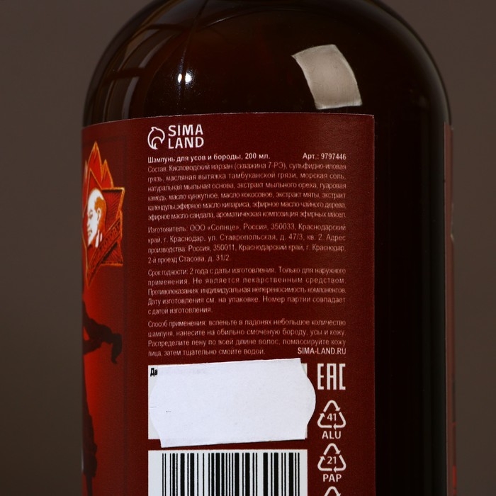 Пусть грязными остаются только ваши мысли при виде красивых женщин. Этот шампунь будет эффективно очищать, питать и оздоравливать волосы, смягчая их неукротимый характер. Растительные масла способствуют увлажнению и заживлению кожи, а их аромат даст почувствовать себя частью дикой природы.Способ применения: вспеньте в ладонях небольшое количество шампуня, нанесите на обильно смоченную бороду, усы и кожу. Распределите пену по всей длине волос, помассируйте кожу лица, затем тщательно смойте водой.Состав: Кисловодский нарзан (скважина 7-РЭ), сульфидно-иловая грязь, масляная вытяжка тамбуканской грязи, морская соль, натуральная мыльная основа, экстракт мыльного ореха, гуаровая камедь, масло кунжутное, масло кокосовое, экстракт мяты, экстракт календулы, эфирное масло кипариса, эфирное масло чайного дерева, эфирное масло сандала, ароматическая композиция эфирных масел.Срок годности: 2 года с даты изготовления. Только для наружного применения. Не является лекарственным