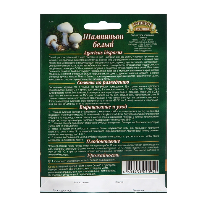 Семена Шампиньон "Белый", на зерновом субстрате, 15 мл