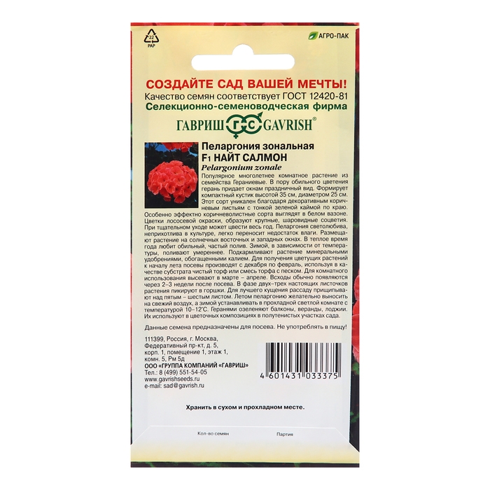 Семена Пеларгония "Найт Салмон", F1, зональная, 4 шт