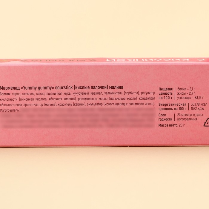 Состав: сироп глюкозы, сахар, пшеничная мука, кукурузный крахмал, увлажнитель (сорбитол), регулятор кислотности (лимонная кислота, яблочная кислота), растительное масло (пальмовое масло), концентрат яблочного сока, ароматизатор (малина), краситель (кармин), эмульгатор (моноглицериды: пальмовое масло).