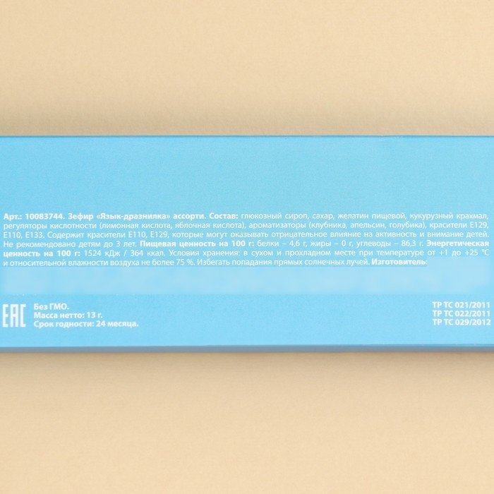 Состав: глюкозный сироп, сахар, желатин пищевой, кукурузный крахмал, регуляторы кислотности (лимонная кислота, яблочная кислота), ароматизаторы (клубника, апельсин, голубика), красители E129, Е110, E133.