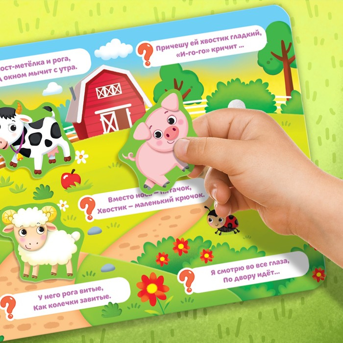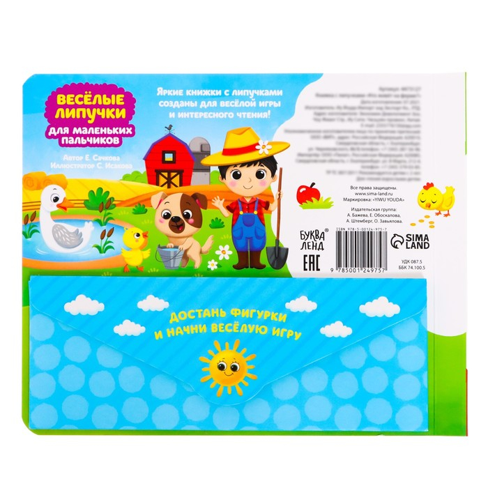 Ваш малыш обожает животных? Тогда эта яркая книга точно понравится крохе. Играя с липучками, ребёнок узнает, какие виды зверей обитают на ферме, и весело проведёт время.