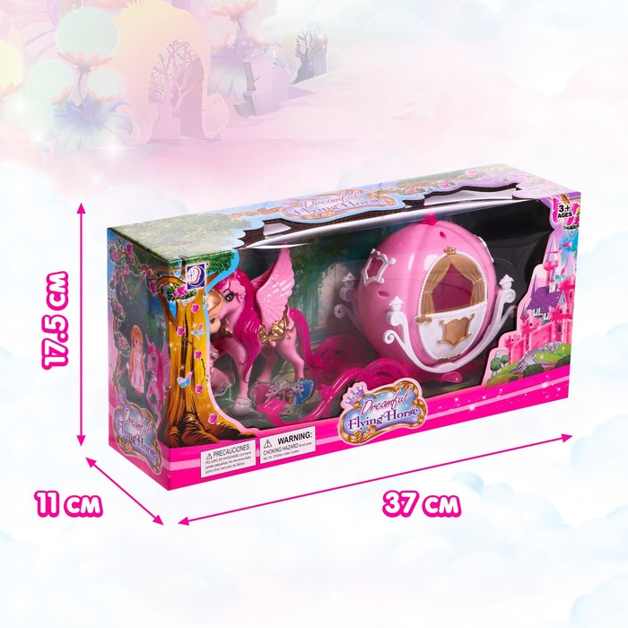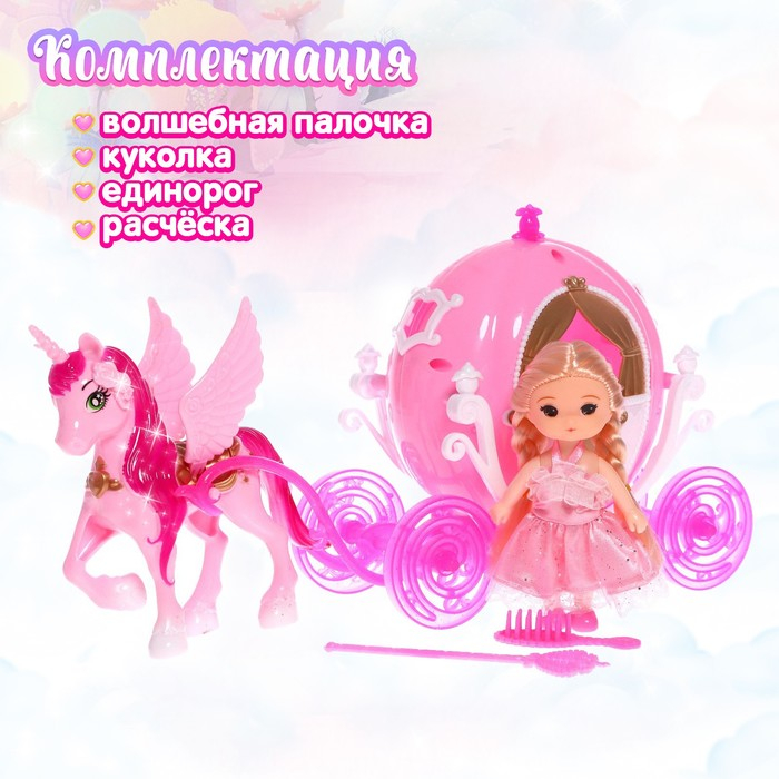 Высота куклы составляет 10 см, кареты — 16 см, единорога — 13 см. В комплекте представлены расчёска и волшебная палочка.