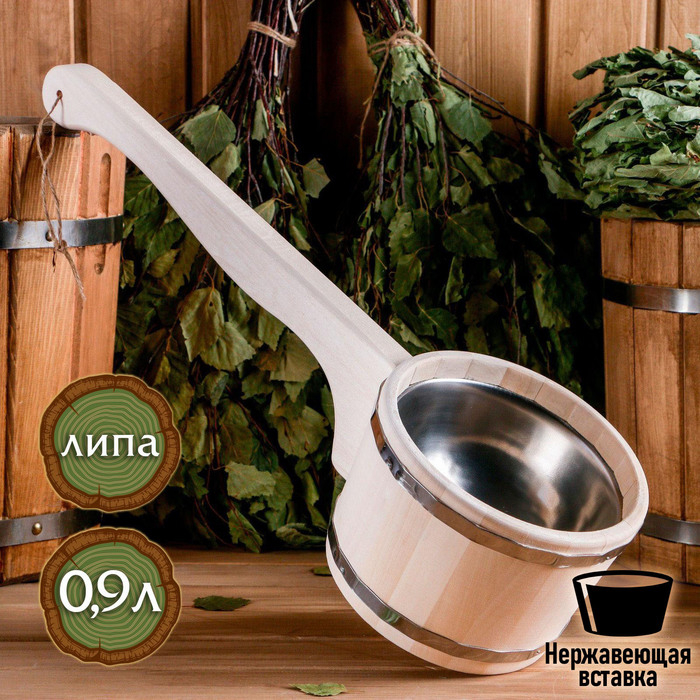 Ковш для бани из липы 0.9л, 51 см, нержавеющая вставка, с горизонтальной ручкой