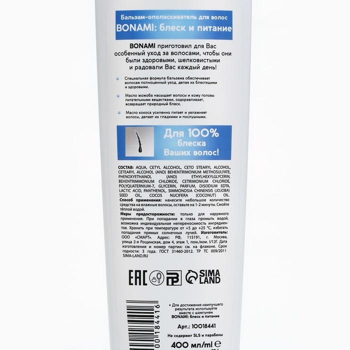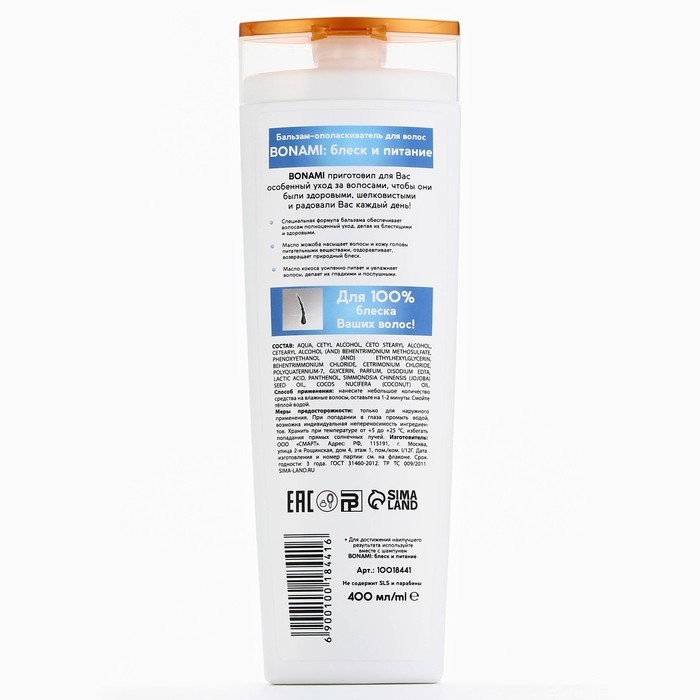 Бальзам для сухих волос с маслом кокоса и жожоба, блеск и питание, 400 мл, BONAMI