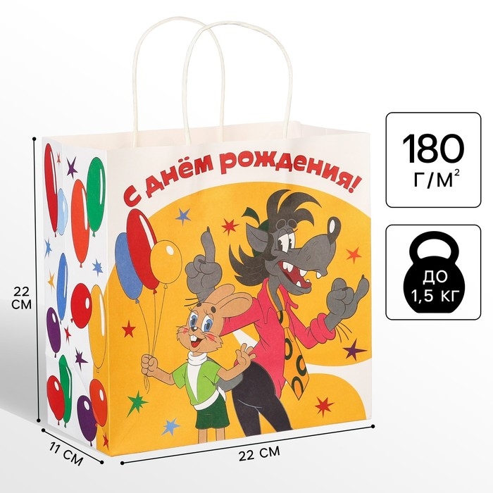 Пакет подарочный "С Днем рождения" 22х22х11 см, крафт, упаковка, Ну, погоди