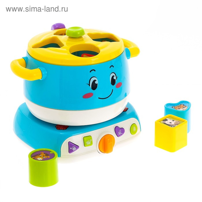 Для каждой фигурки есть своё отверстие в сортере. Опуская маленькую игрушку, ребёнок будет развивать координацию движений и мышление. Нажмите на кнопочку, и вы услышите звуки приготовления пищи и кипения, а также весёлые мелодии. Это сделает игру ещё интересней и реалистичнее.