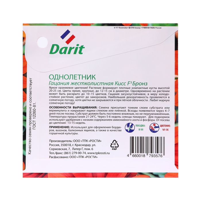 Гацания жестколистная Кисс F1 Бронз, однолетник. Яркие оранжевые соцветия! Растение формирует плотные компактные кусты высотой 20-25 см. Цветы яркие, крупные, до 12-15 см в диаметре. Одновременно на растении может быть раскрыто до 10–15 цветков. Гацания засухоустойчивое, в меру холодостойкое растение, цветет до заморозков. Наибольшая декоративность проявляется в солнечную погоду, хотя цветки не закрываются и при лёгкой облачности. Любит жаркую солнечную погоду! Особенности выращивания: семена посыпают тонким слоем субстрата или вермикулита и накрывают стеклом или пленкой. Всходы появляются через 4-7 дней после посева. Субстрат должен быть постоянно влажным, но не переувлажненным. Температура прорастания 21-24С. Через 5-6 недель сеянцы пикируют. Для подкормок используют удобрения с низким содержанием аммонийного азота и фосфора. От посева до цветения 13-15 недель. Применение: используют для оформления бордюров, вазонов, балконных ящиков, а также в качестве горшечной культуры.