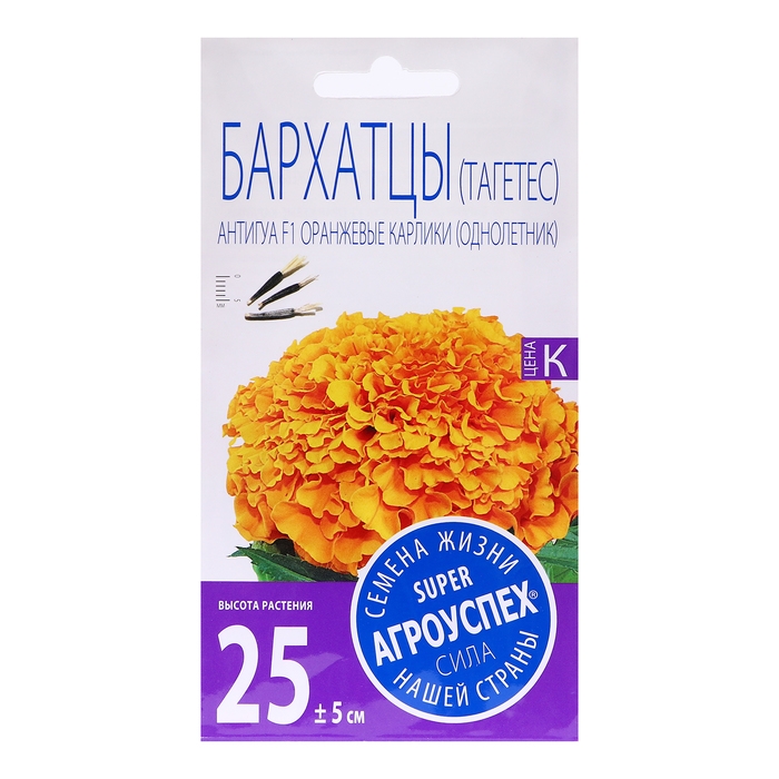 Самые величественные среди бархатцев. Компактный кустик высотой 25-30 см с крупными густомахровыми оранжевыми соцветиями (до 8-10 см) не оставит равнодушным любителей бархатцев. Многочисленные прочные цветоносы насыщенно зеленого цвета все лето до самых морозов покрыты яркими цветками. Растение наиболее устойчиво к неблагоприятным погодным условиям. Используется для цветников, бордюров, клумб. Прекрасно сочетается с сальвией и пеларгонией. Условия выращивания: посев март-апрель на рассаду, в мае возможен высев в открытый грунт в районах с теплым климатом. Рассаду высаживают после угрозы весенних заморозков. Растения, выращенные через рассаду, зацветают раньше и дольше цветут. Не требовательны к почве и влаге. Предпочитают открытые солнечные места. Чтобы продлить цветение необходимо удалять увядшие цветки.