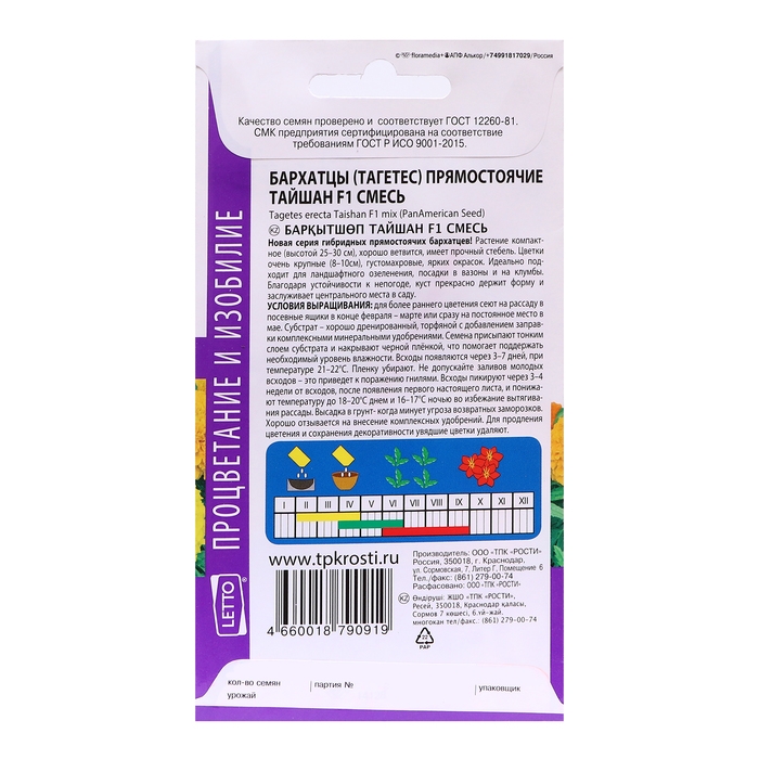 Семена цветов Бархатцы "Тайшан", смесь, Сем. Алт, ц/п, 5 шт