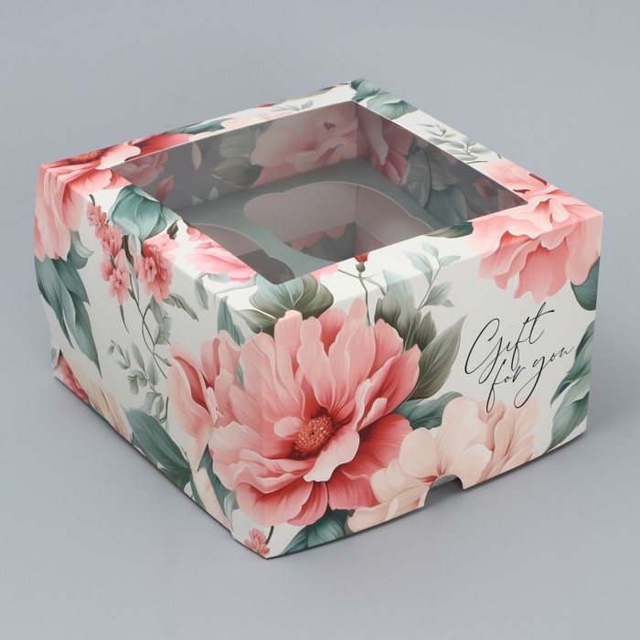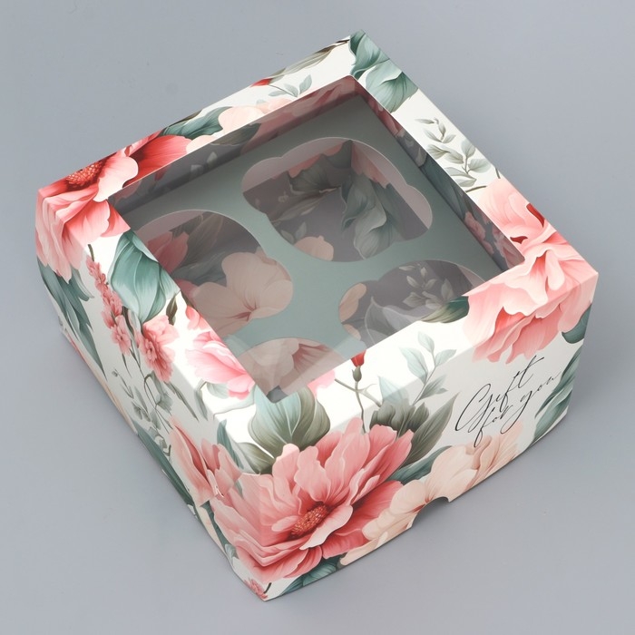 Коробка для капкейков, кондитерская упаковка двухсторонняя, 4 ячейки «Пионы» 16 х 16 х 10 см