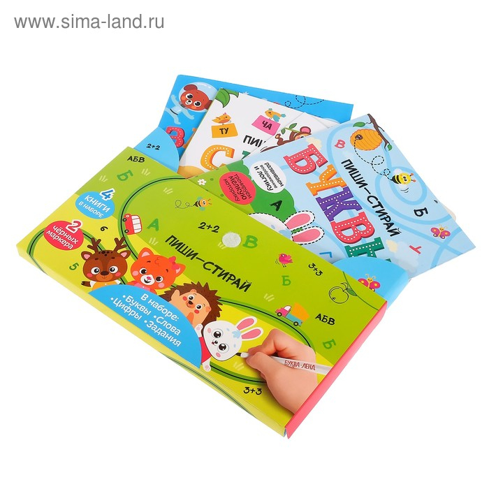 - В комплекте представлено 4 книжки разной тематики и 2 маркера пиши-стирай.
