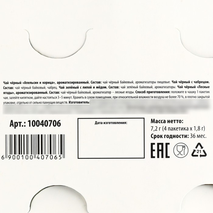 Способ приготовления: 1 чайный пакетик на 250 мл залить горячей водой, настаивать 3–5 минут.