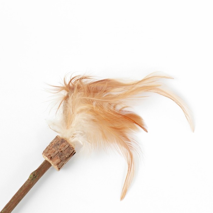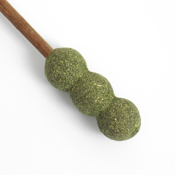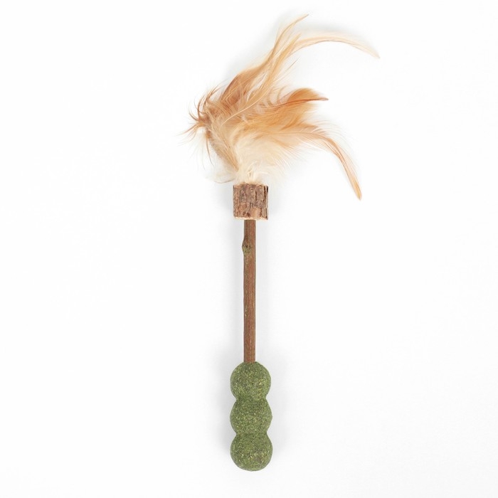 Прессованная мята прикреплена к палочке из мататаби - это натуральное растение, которое обладает особым ароматом и активными веществами, которые привлекают кошек и стимулируют их играть и жевать палочки. Сверху представлены пушистые перья.