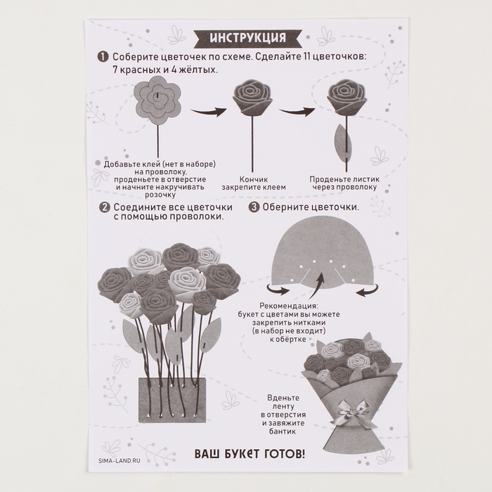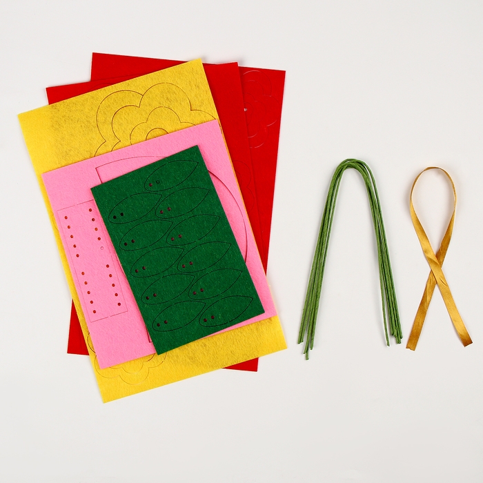 В набор входят фетровые элементы,лента, проволока и инструкция. Малышу достаточно сложить уже вырезанные элементы по инструкции, вставить проволоку, а затем сформироватть цветочки и замечательный подарок готов! Открытку можно подарить близкому человеку.
