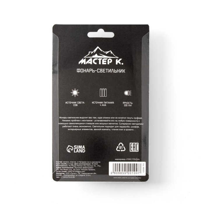 Фонарь-светильник "Мастер К", 220 лм, COB, 4 ААА, магнит, клейкая основа, 11.2 х 7.5 х 3 см