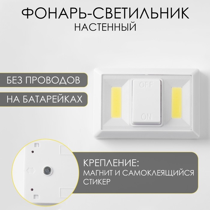 Фонарь-светильник, 3 Вт, 160 лм, COB, 3 ААА, клейкая основа, 4.4 х 2.8 х 13.8 см