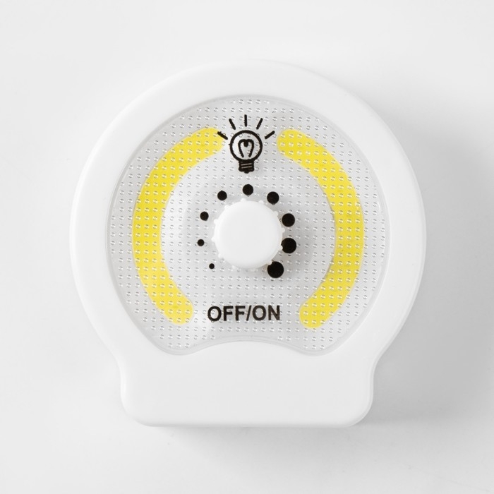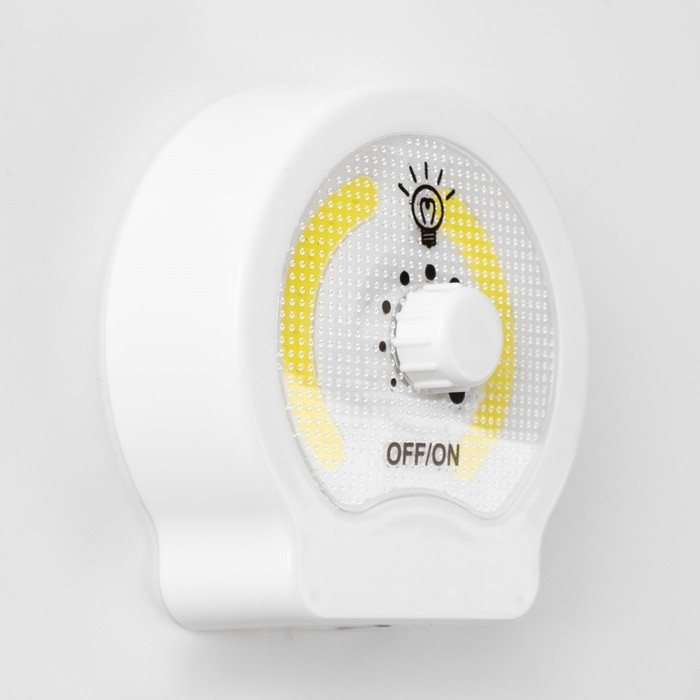 Фонарь - светильник предназначен для включения и выключения искусственного освещения в помещении и на улице. Цвет корпуса светильника-выключателя: белый с двумя жёлтыми вставками в центре корпуса. Можно крепить к поверхности с помощью встроенных магнитов на задней панели или ставить на горизонтальную поверхность с помощью встроенной пластмассовой подставки. Имеется встроенный регулятор яркости на передней панели светильника и встроенный отсек для 3-х батареек типа ААА.