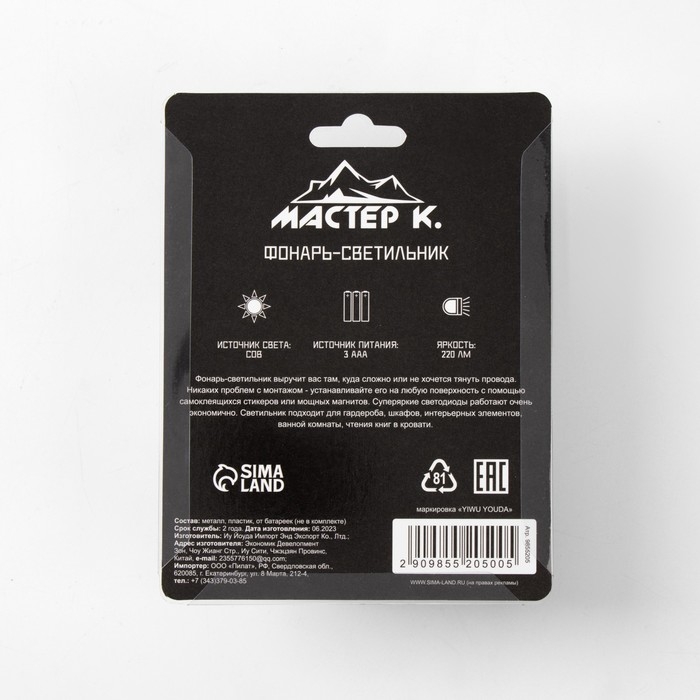 Фонарь-светильник "Мастер К", 220 лм, COB, 3 ААА, магнит, клейкая основа, 9 х 8.8 х 2.8 см