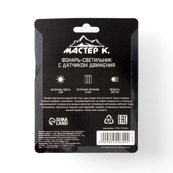 Фонарь-светильник "Мастер К", 220 лм, COB, 3 ААА, магнит, клейкая основа, датчик движения