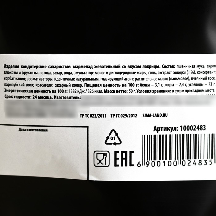 Состав: пшеничная мука, сироп глюкозы и фруктозы, патока, сахар, вода, эмульгатор: моно- и диглециридные жиры; соль, экстракт солодки (1 %), консервант: сорбат калия; ароматизаторы, идентичные натуральным, глазирующий агент: растительное масло (пальмовое), пчелиный воск, карнаубский воск; красители: сахарный колер.
