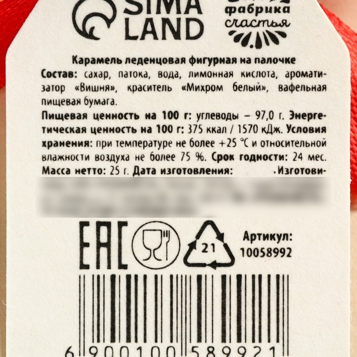 Состав: сахар, патока, вода, лимонная кислота, ароматизатор "Вишня", краситель "Михром белый", вафельная пищевая бумага.