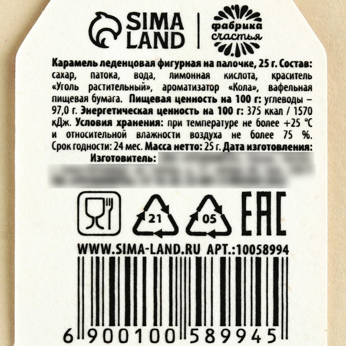Состав: сахар, патока, вода, лимонная кислота, краситель "Уголь растительный", ароматизатор "Кола", вафельная пищевая бумага.