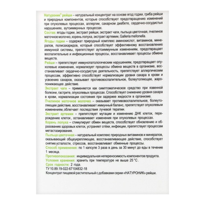 «Натуроник® рейши» – натуральный бальзам на основе ягод годжи, гриба рейши и природных компонентов, который способствует предотвращению изменений при опухолевых процессах, аллергии, сахарном диабете, сердечно-сосудистых нарушениях, аутоиммунных процессах.